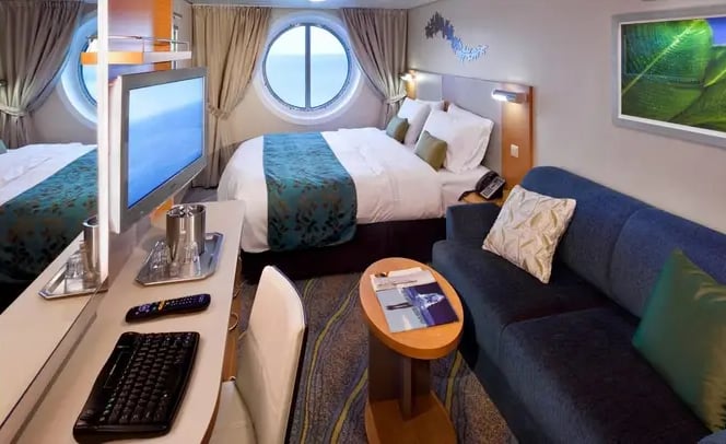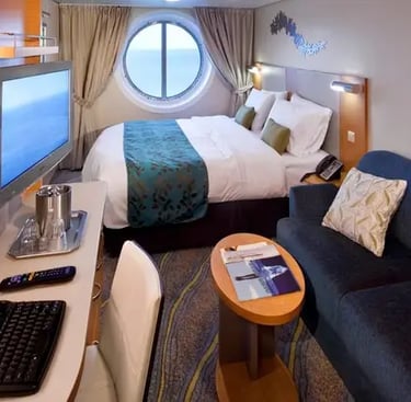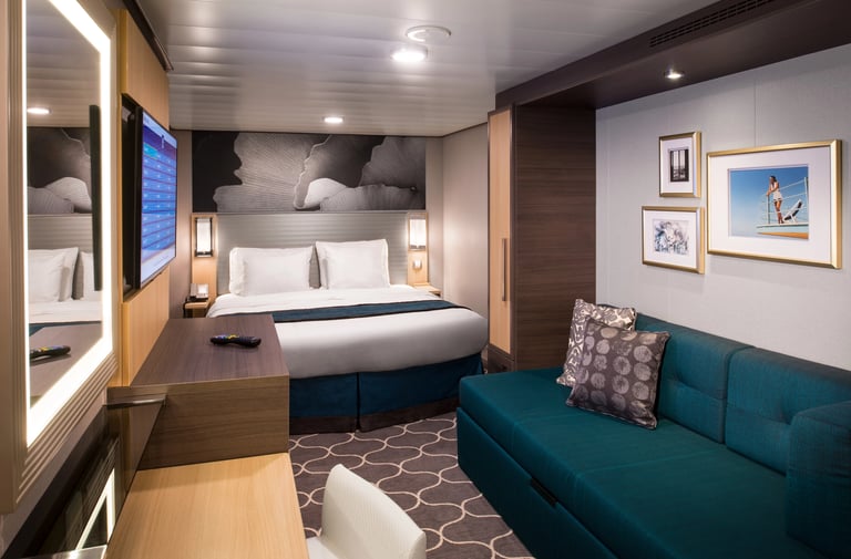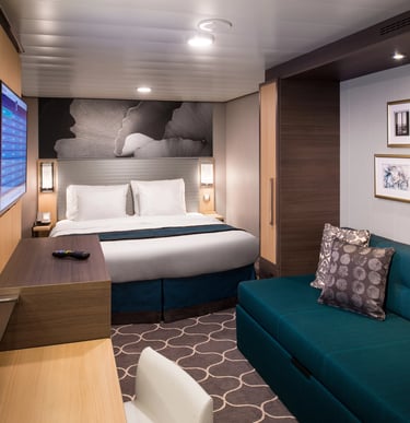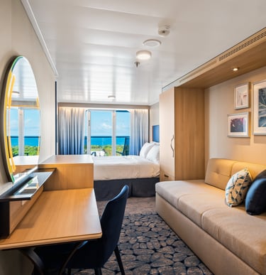 Measuring approximately 172 square feet, these well-appointed rooms are designed for comfort and convenience. Each stateroom features two twin beds that convert to a Royal King, a private bathroom with a shower and premium toiletries, and a sitting area with a vanity and desk.