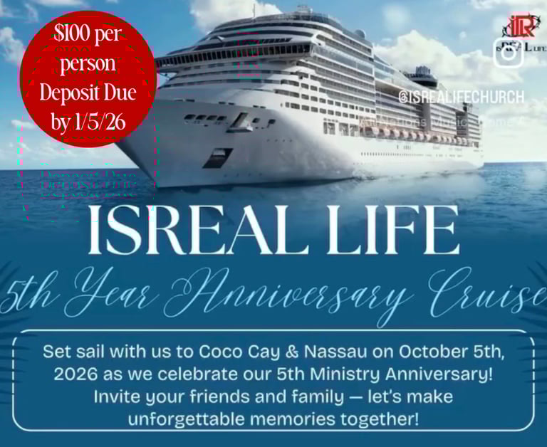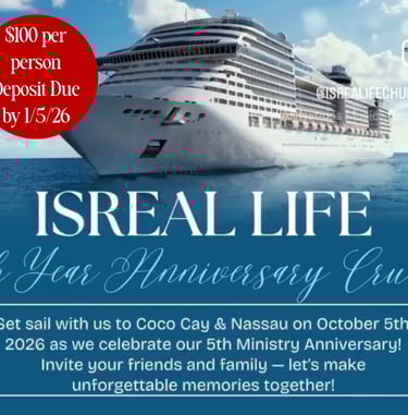 Join IsReal Life Church in celebrating five incredible years of faith, fellowship, and favor — and what better way to honor this milestone than surrounded by the beauty of the ocean and the warmth of our church family and friends!