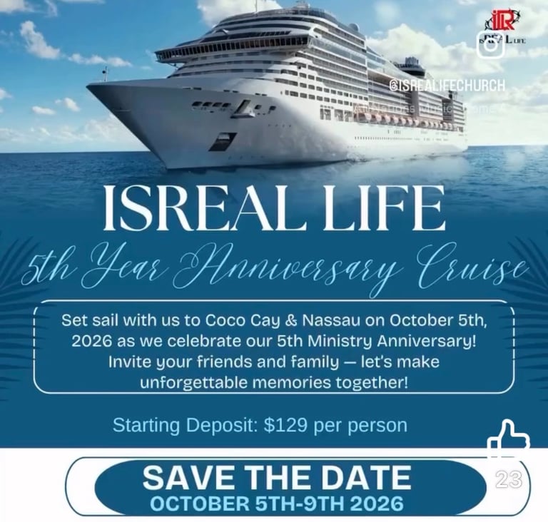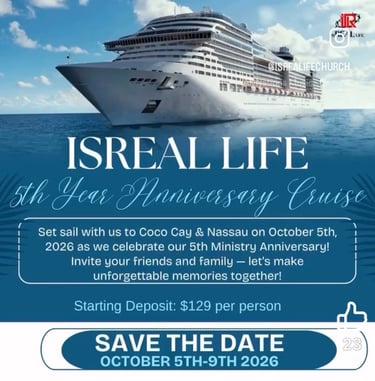 Join Isreal Life Church in celebrating five incredible years of faith, fellowship, and favor — and what better way to honor this milestone than surrounded by the beauty of the ocean and the warmth of our church family and friends!