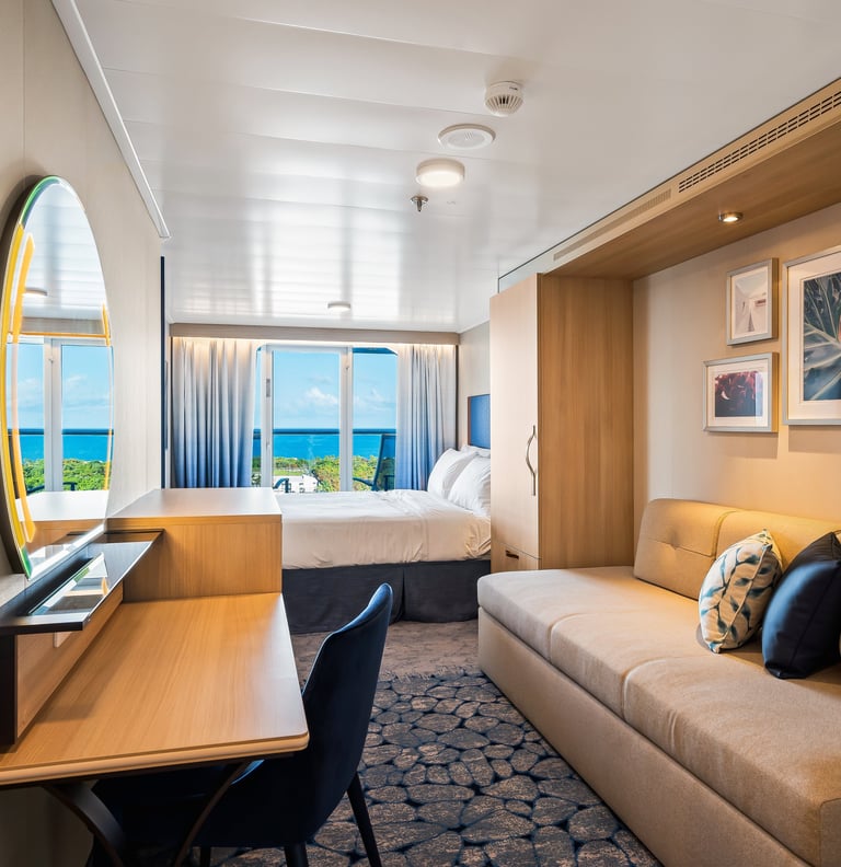 Experience the perfect blend of comfort and scenery in the Ocean View Balcony Stateroom aboard Wonder of the Seas.