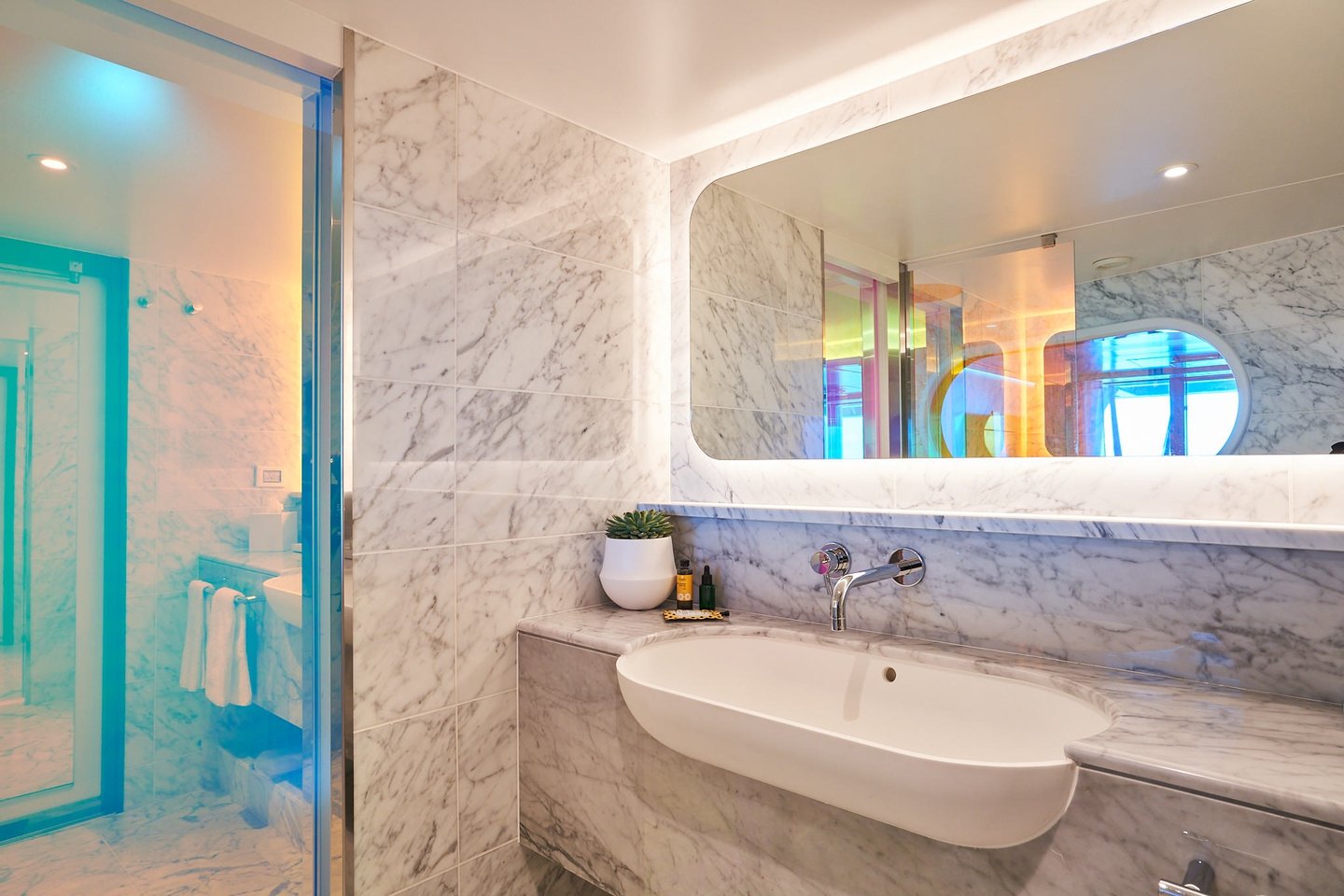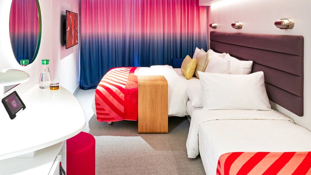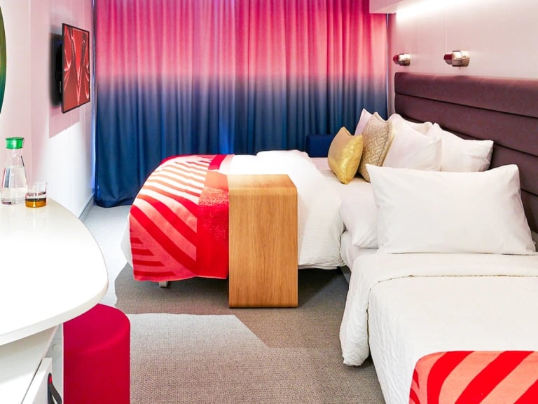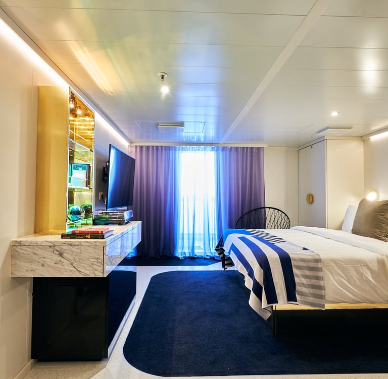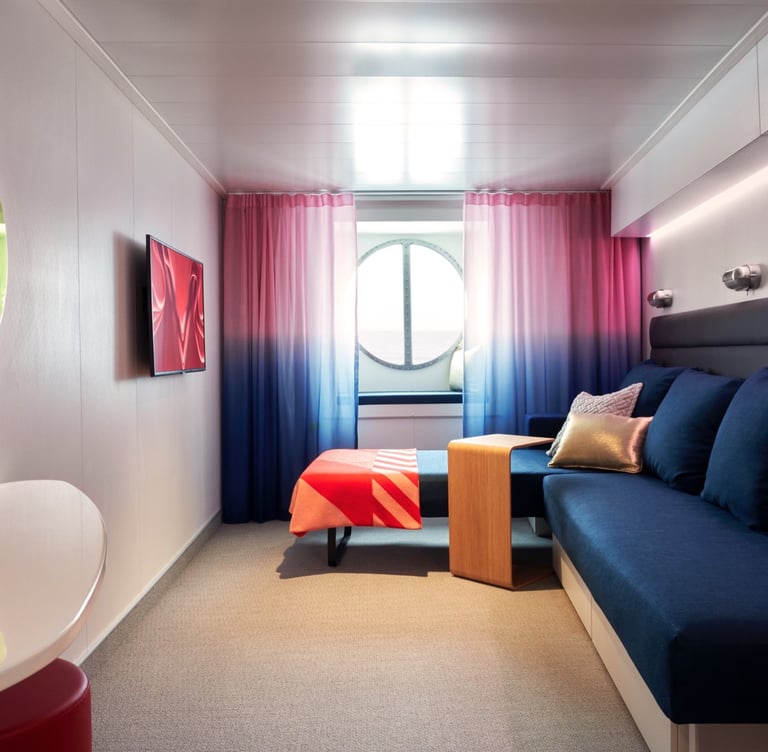 Insider cabins are Virgin Voyages' interior staterooms with no window. These cabins range from 105 to 177 sq ft. Some select cabins can accommodate up to 3 sailors.