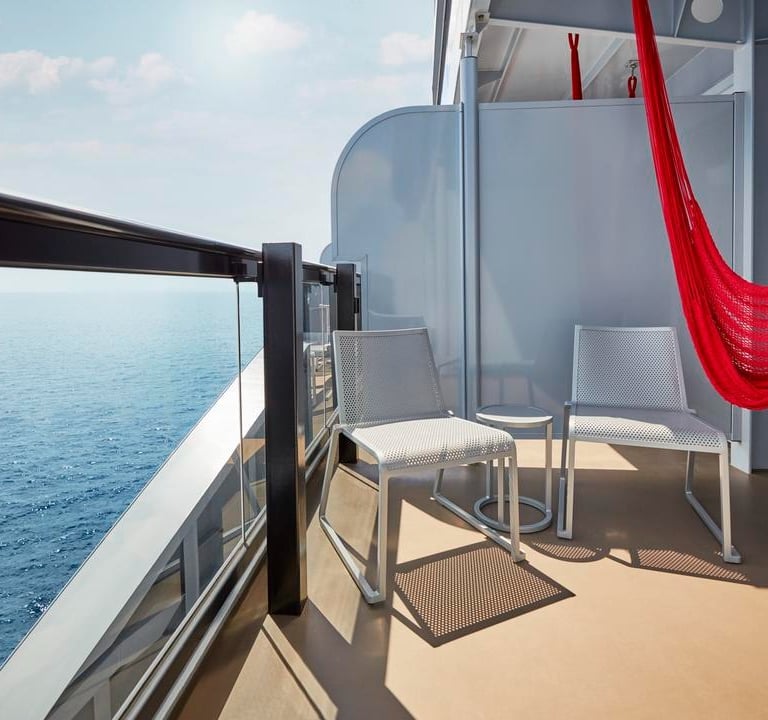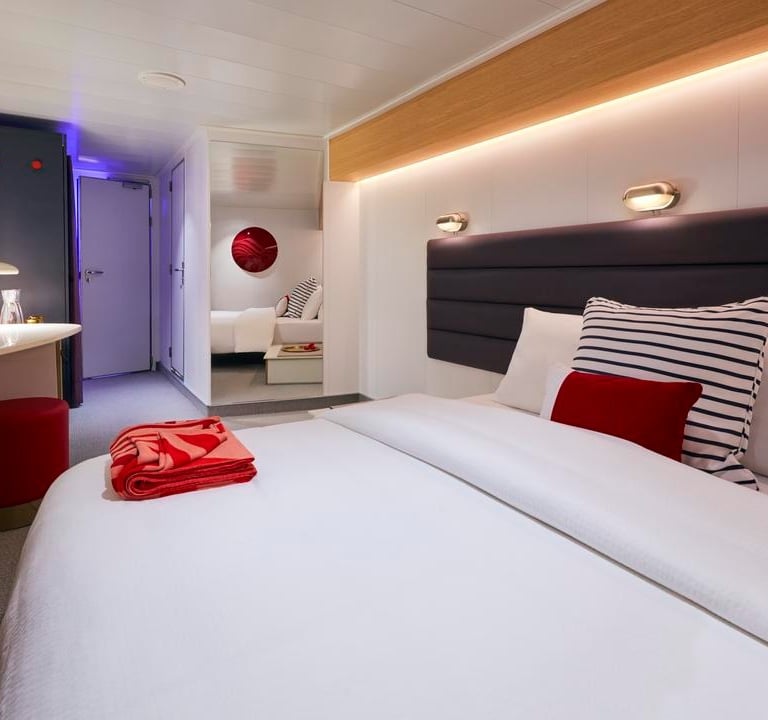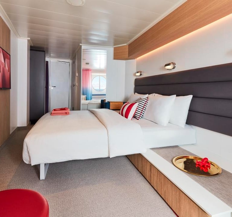 The Sea Terrace is Virgin Voyages' standard balcony cabin. Measuring approximately 225 sq ft, the modern stylish design features splashes of Virgin's signature red color.