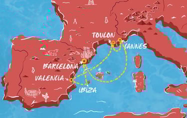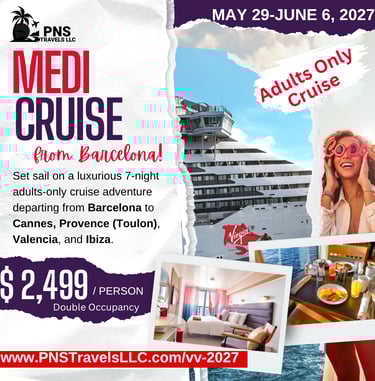 Join us for a luxurious 7-night adults-only Virgin Voyages Mediterranean Cruise sailing from Barcelona, exploring the stunning coastlines and the vibrant cities of Cannes, Provence (Toulon), Valencia, and Ibiza. With stylish accommodations, world-class dining, and unforgettable destinations—this is the escape you’ve been waiting for.