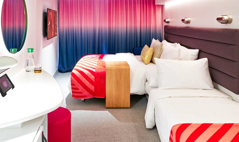Insider cabins are Virgin Voyages' interior staterooms with no window. These cabins range from 105 to 177 sq ft. Some select cabins can accommodate up to 3 sailors.