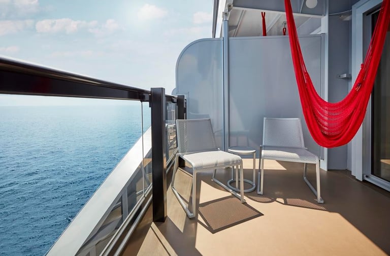 The Sea Terrace is Virgin Voyages' standard balcony cabin. Measuring approximately 225 sq ft, the modern stylish design features splashes of Virgin's signature red color.